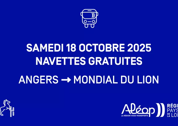 Transport 24/09/2025 Aléop vous emmène gratuitement au Mondial du Lion Le Mondial du Lion se tiendra au Lion d'Angers du 16 au 19 octobre 2025. Ce rendez-vous emblématique du Maine-et-Loire allie le sport de haut niveau à une ambiance festive et familiale.Pour l'occasion, Aléop met en place des navettes gratuites le samedi 18 octobre pour vous y emmener depuis Angers. C'est l'occasion parfaite de ne pas manquer l'épreuve la plus attendue : le cross et ses spectaculaires sauts d'obstacles.Horaires des navettes :Aller (depuis la gare routière d'Angers vers Le Lion d'Angers) : 9h00, 10h30 et 12h00Retour (depuis Le Lion d'Angers vers Angers) : 15h45, 17h00 et 18h15Réservez votre place !Pour profiter de ce service, réservez vos places :Par téléphone auprès de la gare routière d'Angers au 02 41 36 29 46 Ou directement en ligne via ce formulaire